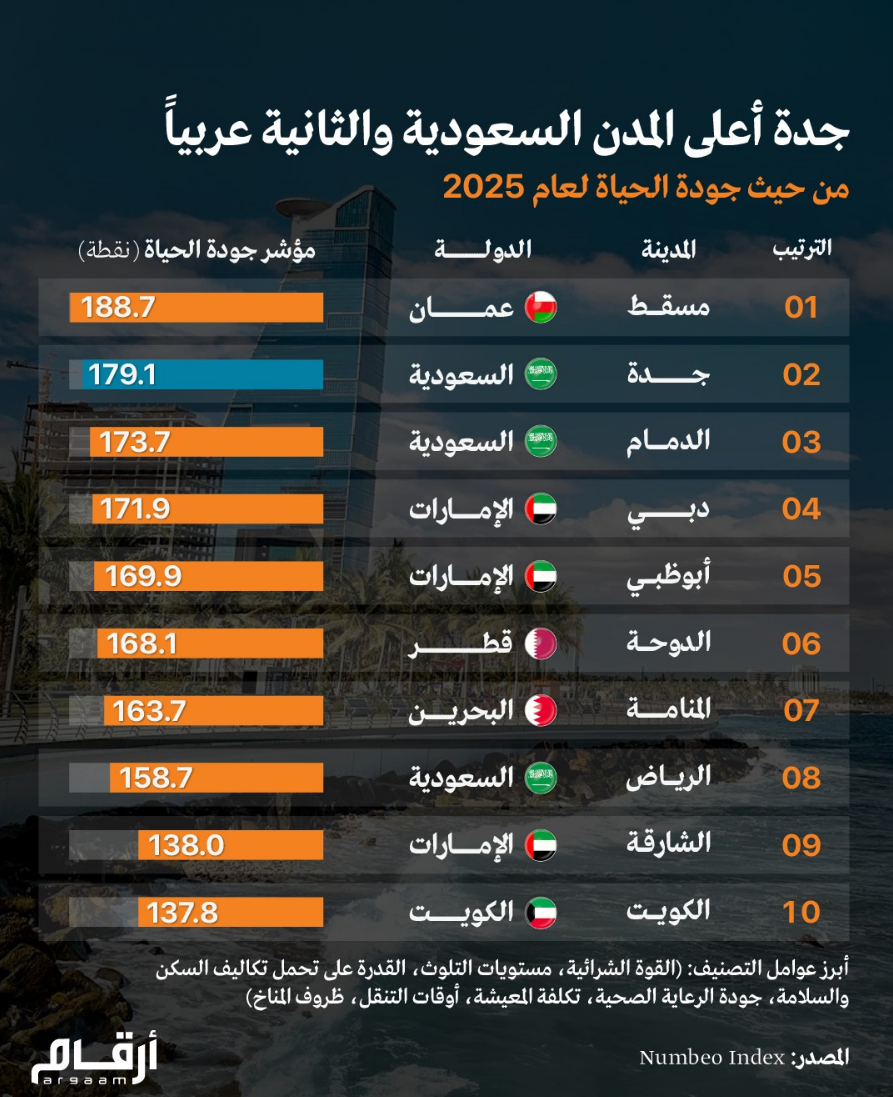 في إنجاز يُعدّ مؤشراً على التقدم المتسارع في تطوير البنية التحتية والخدمات الحضرية، تصدرت مدينة جدة قائمة أفضل المدن السعودية والعربية من حيث جودة الحياة لعام 2025، وفقاً لتقرير صادر عن مؤشر “Numbeo Index” وتم نشره عبر منصة “أرقام”.